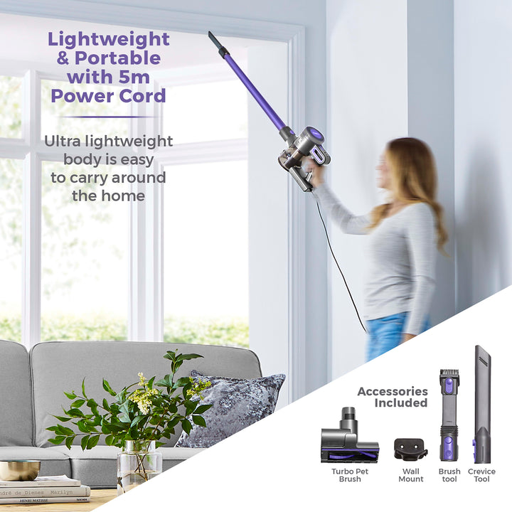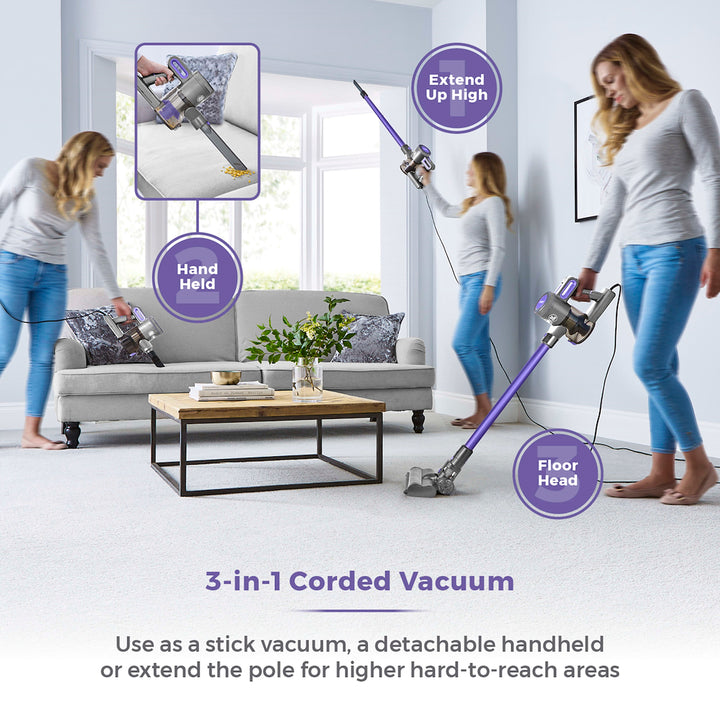 Effortlessly achieve a more efficient and deeper clean around the home with the VL20 3-in-1 Performance Corded Vacuum Cleaner. Its powerful suction capability with a 400W motor makes for hassle-free cleaning. Use as a pole vacuum for carpets and hard floors, a detachable handheld for cars, stairs and upholstery or use the pole for higher hard-to-reach areas like ceilings and curtains. The cyclonic 18KPA suction provides consistent airflow, effortlessly sucking up and breaking down dirt from all floor types for a thorough clean. Its ultra-efficient motorised floor head agitates dust and dirt leaving carpets and hard floors clean and fresh. It transforms into a handheld vacuum that is perfect for staircases, cars, upholstery and pet hair. An anti-allergy HEPA filter removes 99.95% of fine particles from 0.3 microns, making it ideal for allergy sufferers. Its ultra-lightweight body is easy to carry and move from room to room, for cleaning up high or down low anywhere in the home.