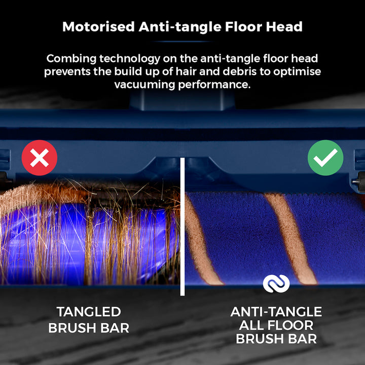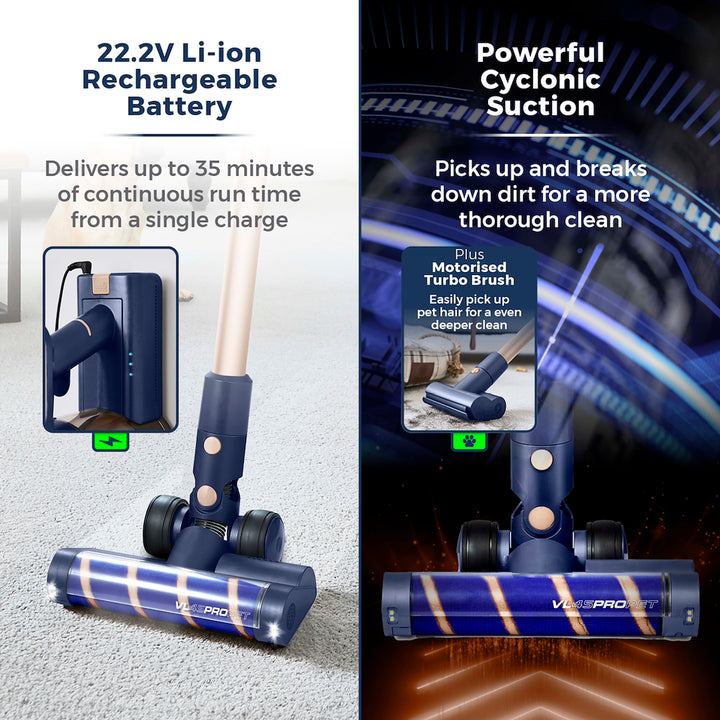 Effortlessly achieve a more efficient and deeper clean around the home with the VL45 Pro Pet 3-in-1 Vacuum Cleaner. Its powerful built-in rechargeable battery delivers 35 minutes of continuous run time from a single 4 hour charge for hassle-free cleaning. Use as a cordless vacuum for carpets and hard floors, a detachable handheld for cars, stairs and upholstery or extend the pole for higher hard-to-reach areas like ceilings and curtains. The cyclonic suction provides consistent airflow, effortlessly sucking up and breaking down dirt from all floor types for a thorough clean. Its ultra-efficient motorised floor head agitates dust and dirt leaving carpets and hard floors clean and fresh. The turbo pet and upholstery brush head effortlessly picks up deeply embedded pet hair so you get a more efficient and deeper clean around the home, while the Anti-tangle function on the brush head ensures no more messy hair wind up on the brush.