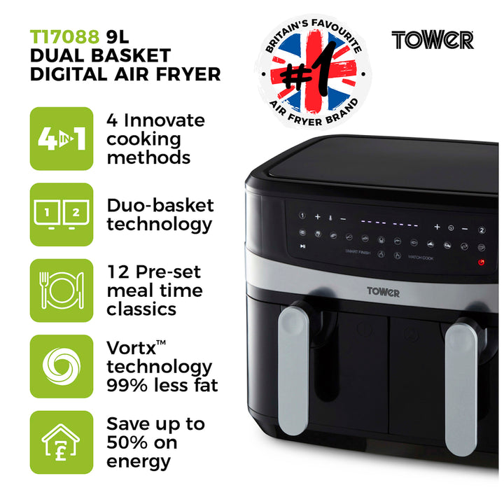 Tower T17088 Air Fryer 9LT Dual Basket - Black