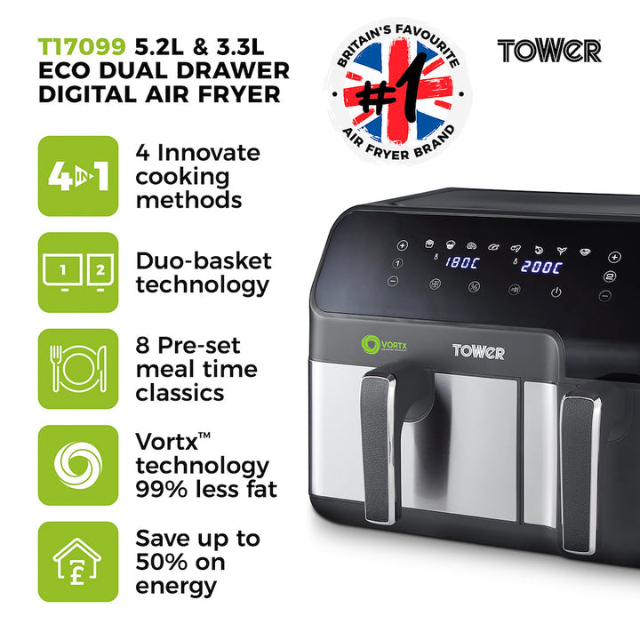 Tower T17099 Eco Duo Air Fryer Grey Digital 5.2L + 3.3L