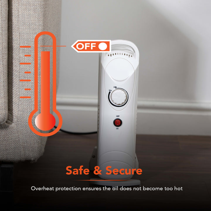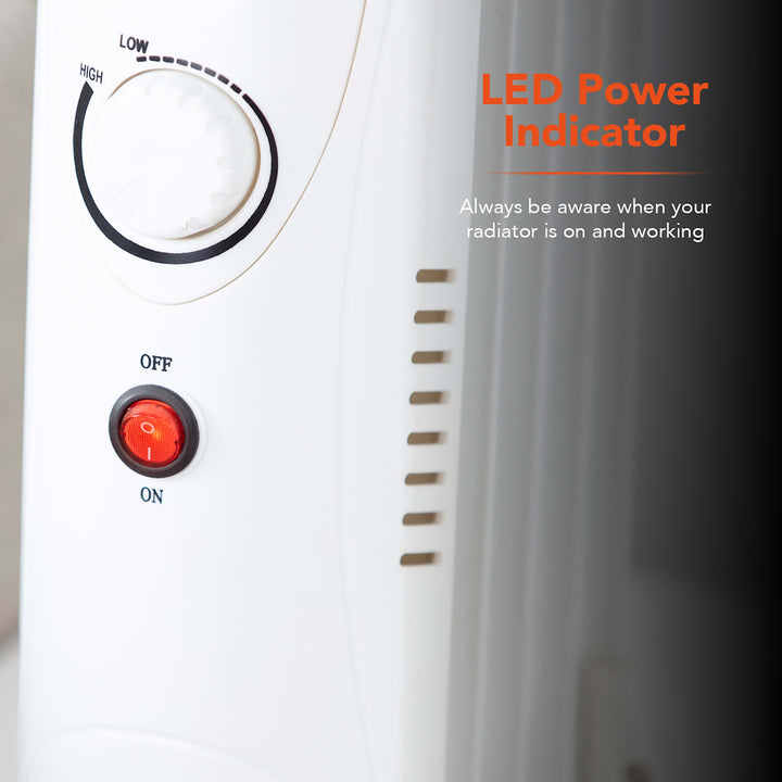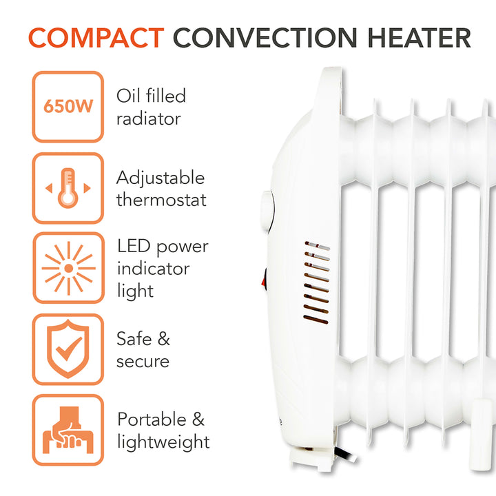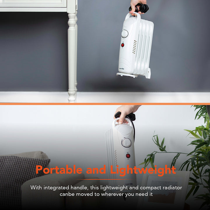 Make your home cosy with warmth using Warmlite's efficient and stylish oil filled radiator. With 5 heated fins and 650W of power, this easy-to-use small radiator has a mighty performance to rapidly heat up rooms of your choosing ready for winter days. The adjustable thermostat with a maximum temperature of 105C makes finding the perfect temperature simply creating a comfortable setting in your home or office. Never forget to turn the radiator off, as when the unit is in operation, it will notify you with the LED power indicator light. Featuring safety functions, it comes with built-in overheat protection, preventing the oil from becoming too hot making it safe to use around pets and children. The tip-over switch automatically switches the unit off if accidentally knocked over. An integrated handle allows you to move the portable and lightweight radiator to whichever room you need it.
