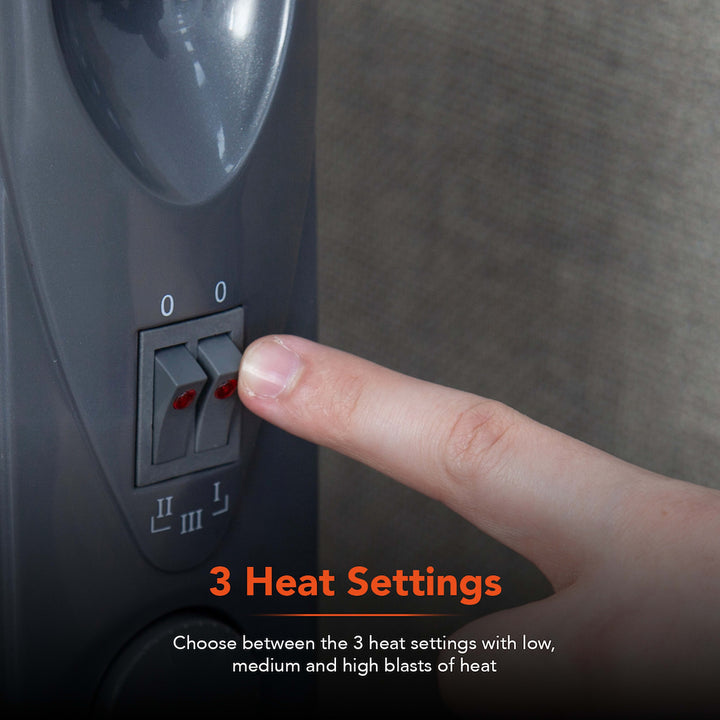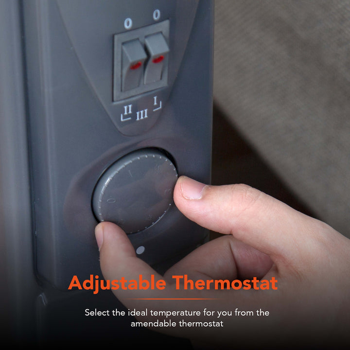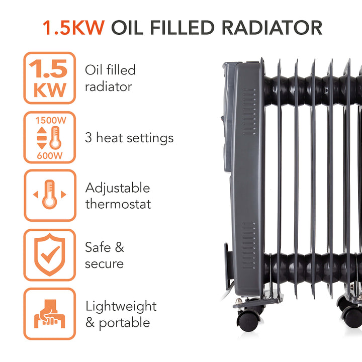 Featuring 7 oil-filled fins, this radiator effectively heats up any room using environmentally friendly conducting oil, to sustain a consistent temperature to enjoy over a long period of time. The easy to navigate control panel features an adjustable thermostat with the choice of 3 temperature settings from 600W, 900W and 1500W of heat, so you can set the ideal heating level for you. The four gliding castor wheels provide easy movement between rooms and the overheat protection ensures safe operation during use.