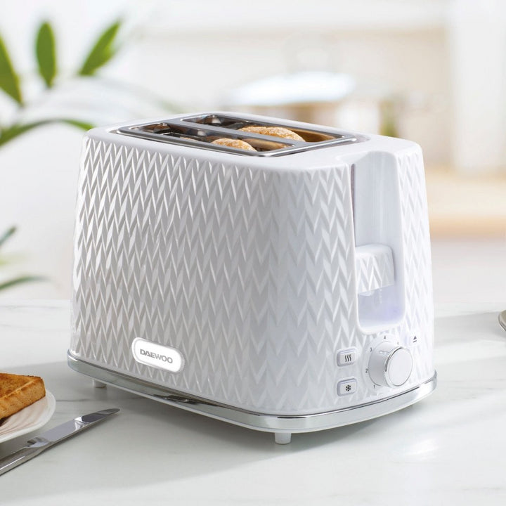 Daewoo Argyle 2 Slice Patterned Toaster | Reheat, Defrost & Cancel Controls | Electronic Browning Feature | Removable Crumb Tray | Anti-Jam Function | Self-Centering | 220-240V/50-60Hz/780-930W - White